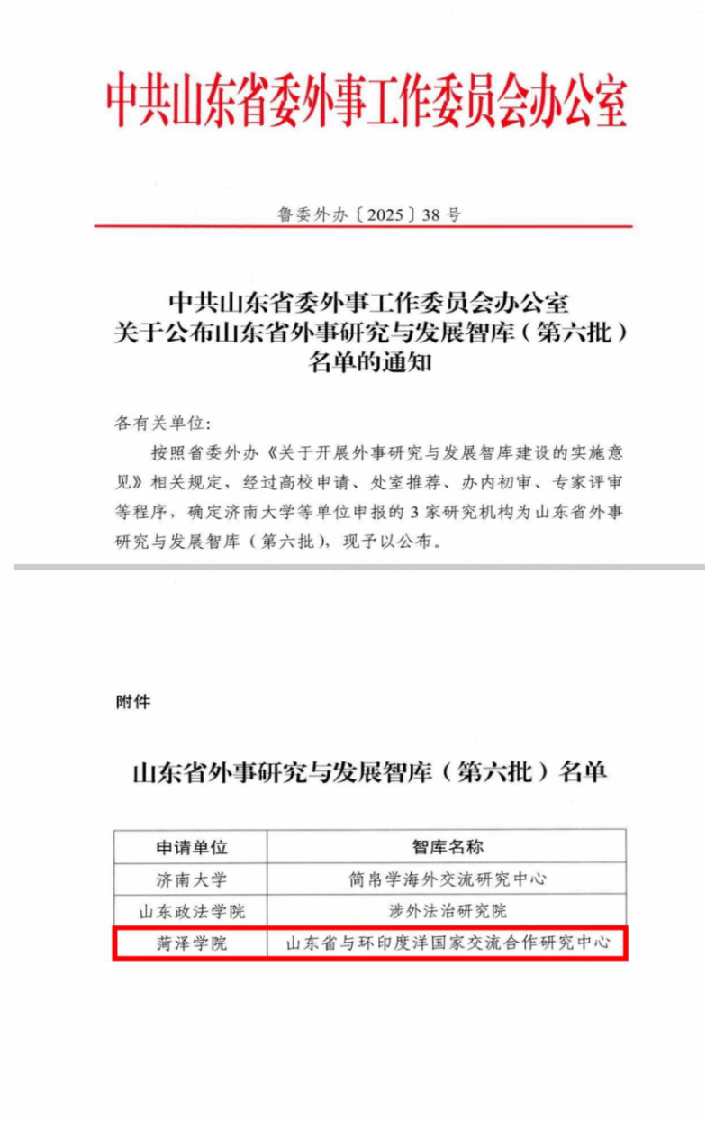 近日,中共山东省委外事工作委员会办公室发布了《关于公布山东省外事研究与发展智库(第六批)名单的通知》(鲁委外办[2025]38号),确定3家研究机构为山东省外事研究与发展智库(第六批),其中,我校申报的“山东省与环印度洋国家交流合作研究中心”成功入选。