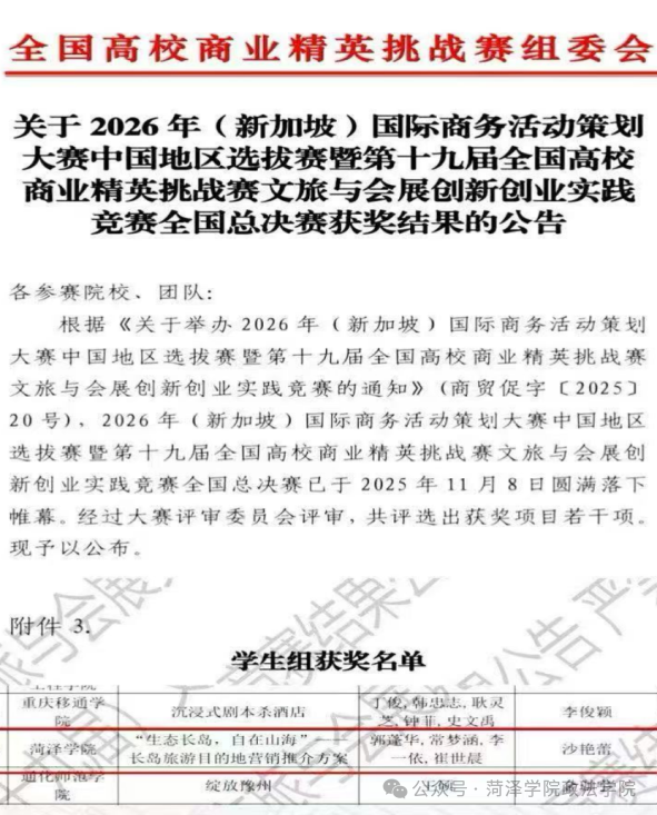 近日,第十九届全国高校商业精英挑战赛文旅与会展创新创业实践竞赛全国总决赛获奖名单公布。由QY千亿球友会沙艳蕾副教授指导,QY千亿球友会学生郭蓬华、常梦涵、李一依、崔世晨完成的《“生态长岛,自在山海”——长岛旅游目的地营销推介方案》项目在全国众多作品中脱颖而出,荣获全国三等奖。