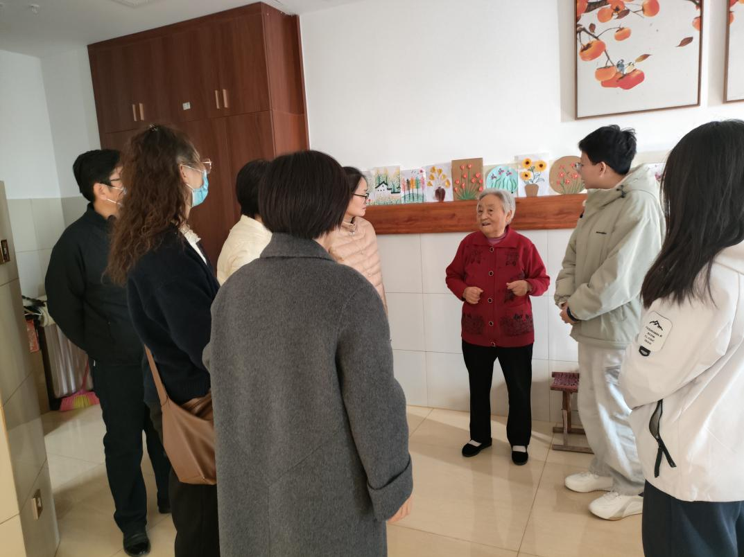 “互联网+智慧养老”医养结合示范项目——馨康智慧养老服务中心,中心负责人系统介绍了如何依托智能监测设备、远程诊疗系统及一体化信息平台,实现对入住长者健康指标、安全状况与生活需求的24小时动态监测与精准响应。该模式融合日常生活照料、专业医疗康复和人文关怀,展现了数字化时代养老服务的系统化、连续性与温度。同学们通过实地参观银龄书院、党员活动室、老年康复区、智慧养老区以及老人的居住空间,不仅直观感受到科技如何提升养老服务质量,也从墙面与桌上一件件老人亲手创作的剪纸、编织和画作中,体会到“老有所为、老有所乐”的具体内涵。俯身倾听老人讲述作品背后的故事,笑容与回忆在交谈中流动,“为您提供最优质的服务,是我们最高的追求”不再是一句标语,而是可触可感的服务细节。