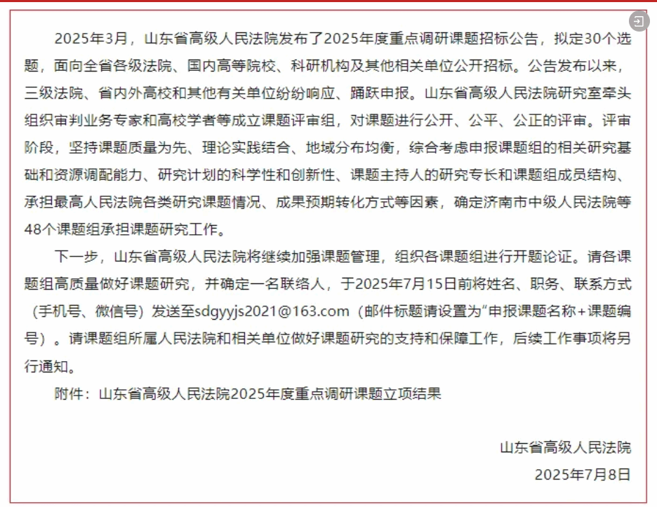 近日,山东省高级人民法院发布《山东省高级人民法院2025年度重点调研课题立项结果公告》,来自国内高校、全省各级法院、科研机构等48个课题组中标33项重点调研课题,其中,由QY千亿球友会与菏泽市中级人民法院联合申报的《〈民法典〉视域下人格权司法保护研究》课题(课题编号:SDGYKT2025B09-1)获得立项。