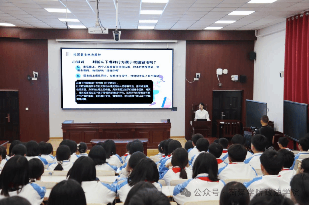 此次活动以预防校园欺凌为主题,通过模拟法庭庭审观摩、校园欺凌防治专题讲座形式,为学生提供沉浸式法治教育体验。在模拟法庭演示中,青年志愿者对校园霸凌案进行模拟,向学生们科普相关法庭审判流程,让学生们更加直观地感受到法律的威严。专题讲座围绕《未成年人保护法》《预防未成年人犯罪法》法律法规展开,结合典型案例剖析,系统讲解校园欺凌的法律界定与防范措施,有效提升青少年群体的法治素养和自我保护意识。